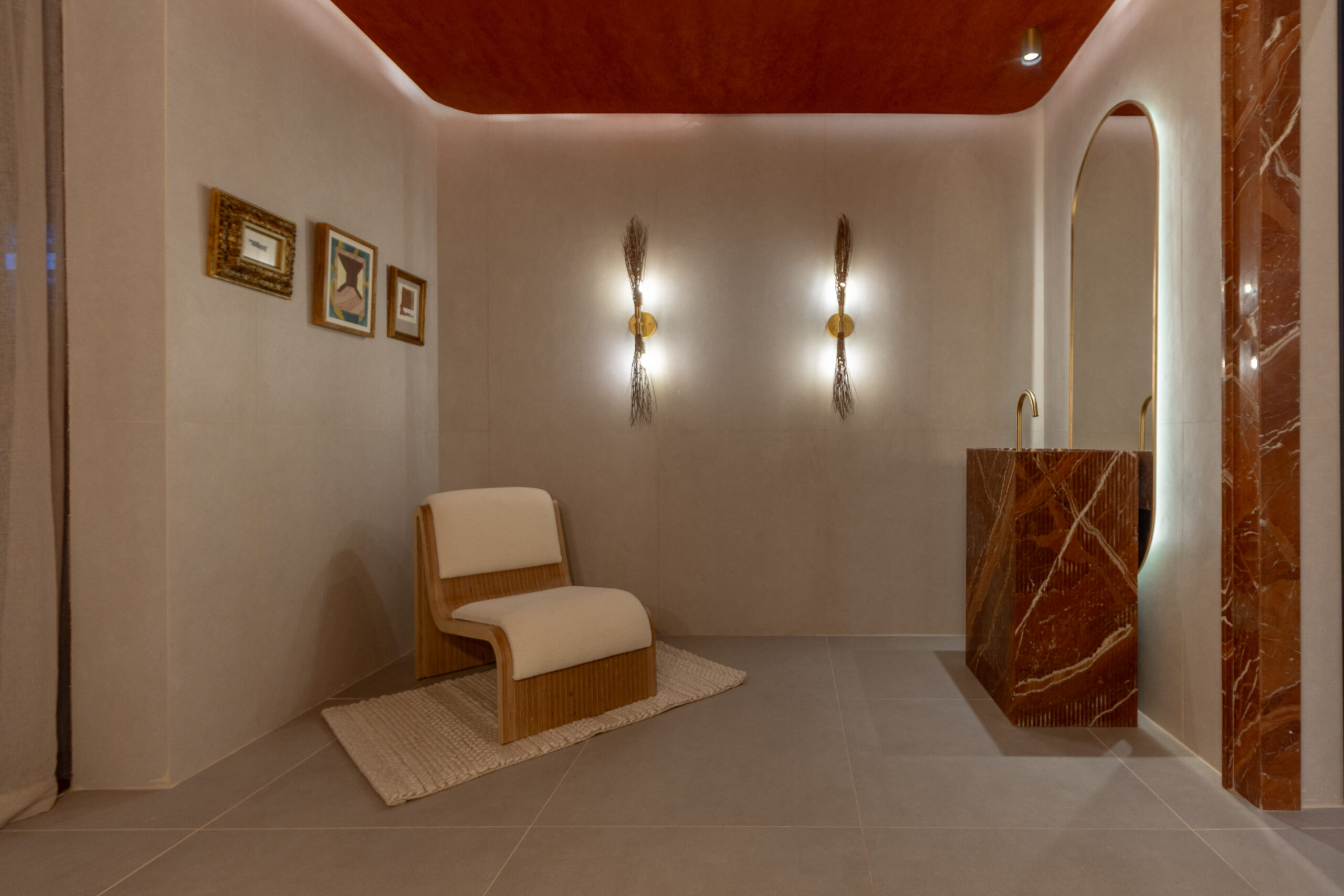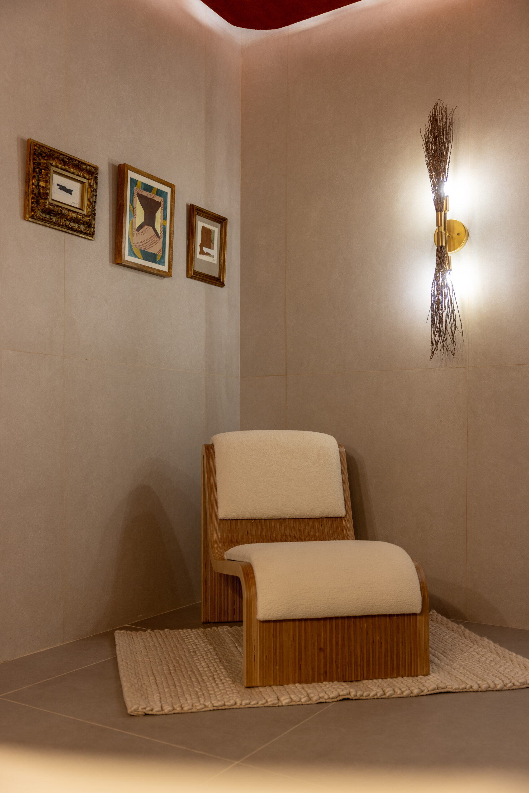 Detalles como el techo texturado, las luminarias de fibra natural, los acentos dorados y la butaca completan un espacio pensado para disfrutar y relajarse: una verdadera antesala del bienestar.