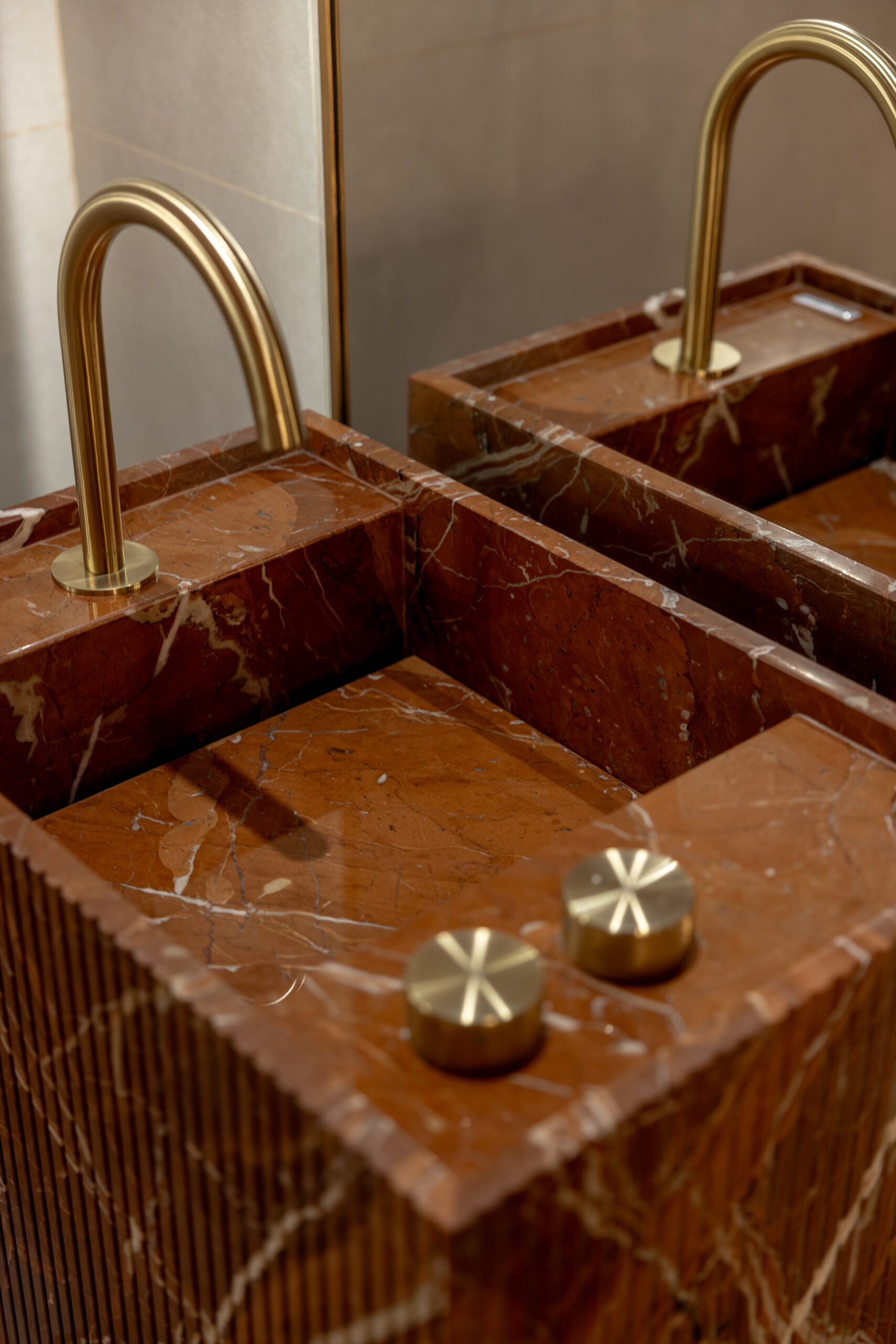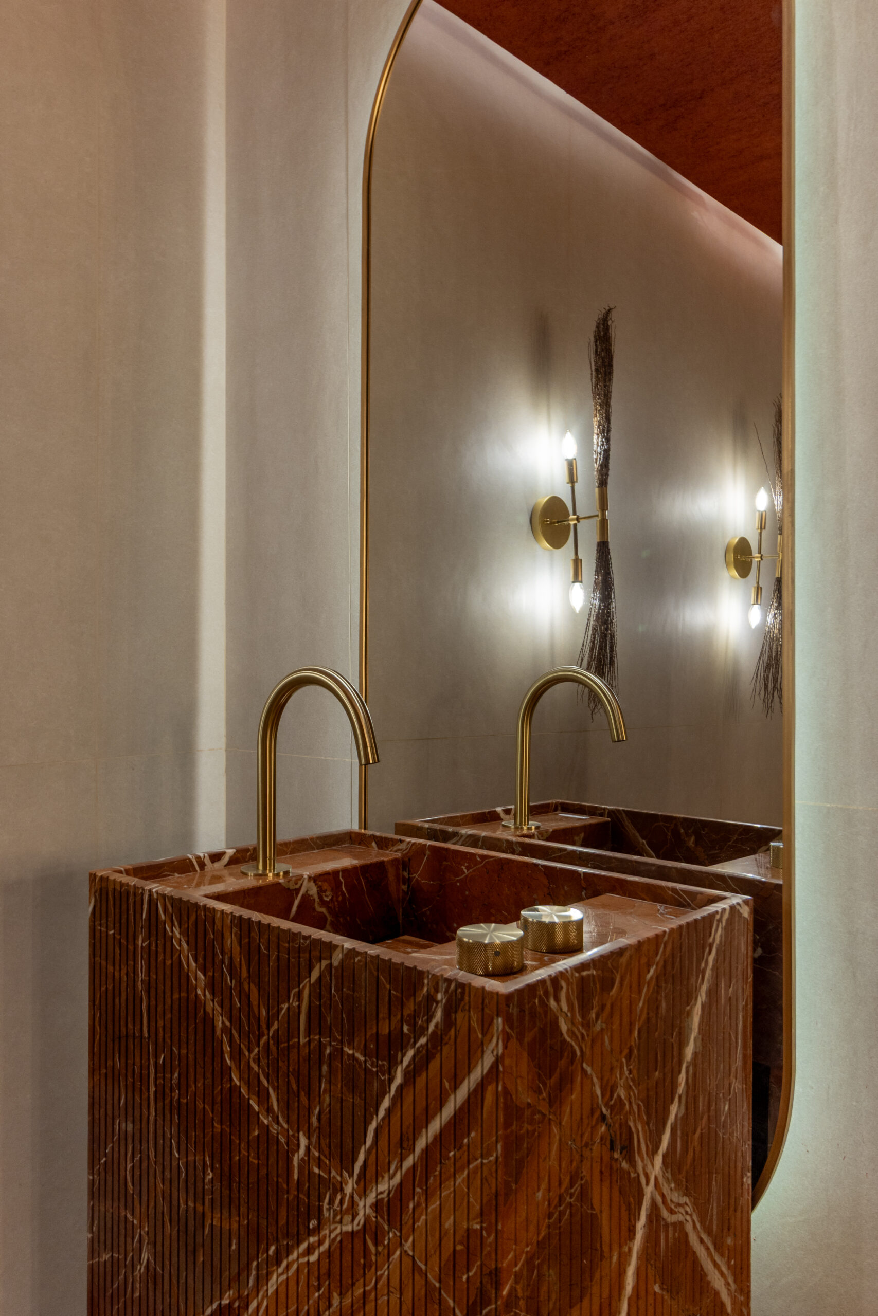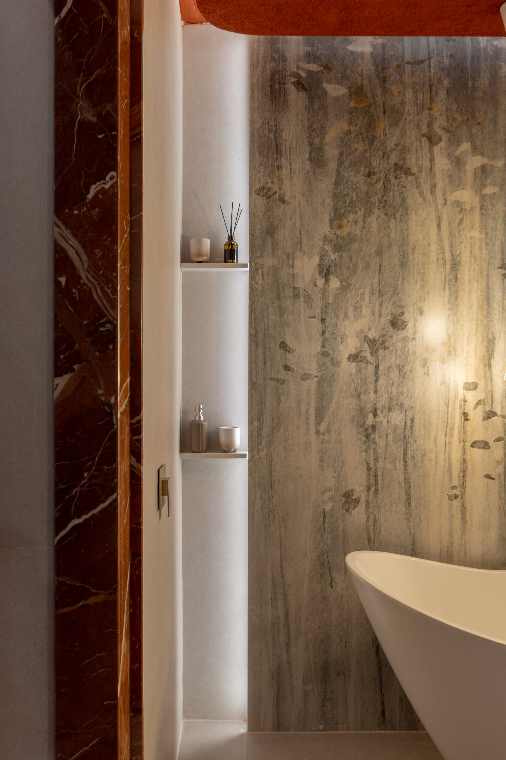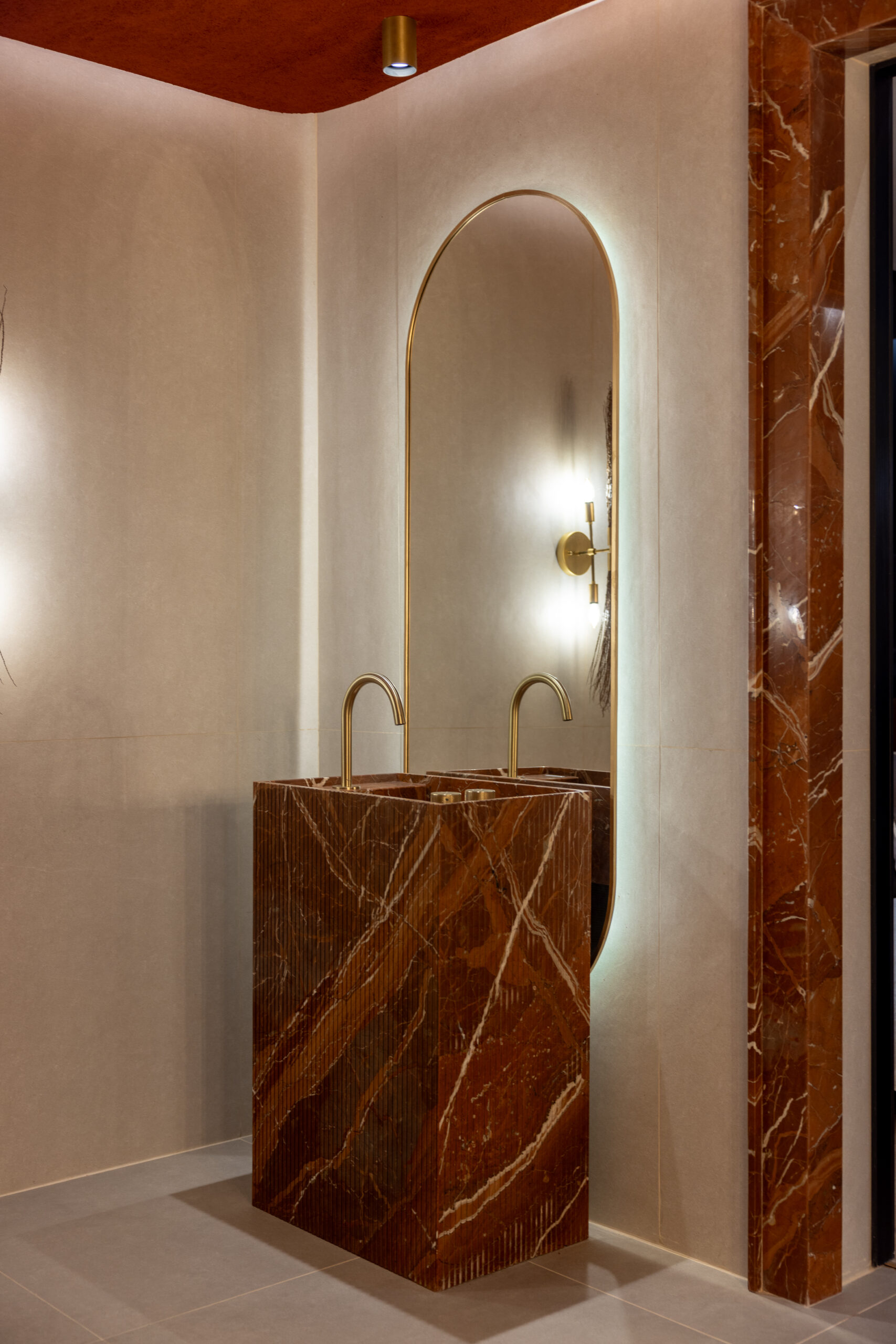 El mármol rojo ibérico fue otro de los protagonistas. Su intensidad y vetas contrastan con los tonos azulados del revestimiento, generando in equilibrio entre fuerza y elegancia.