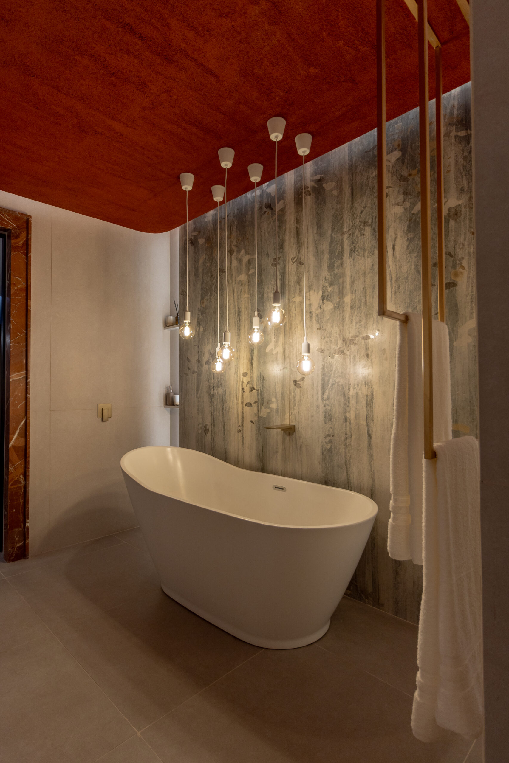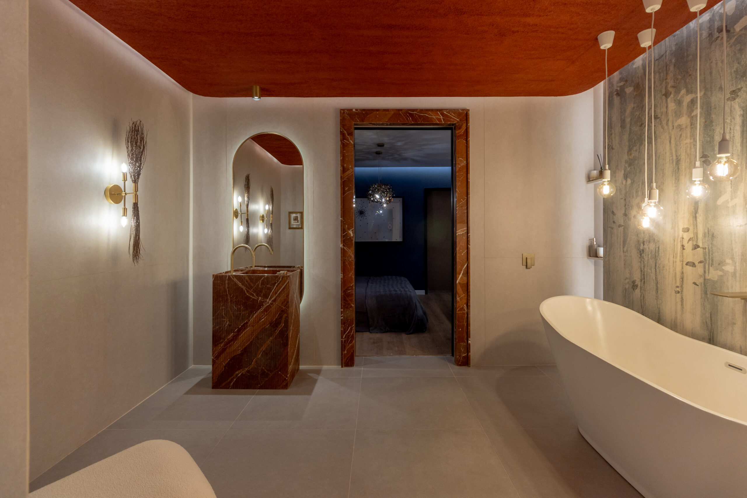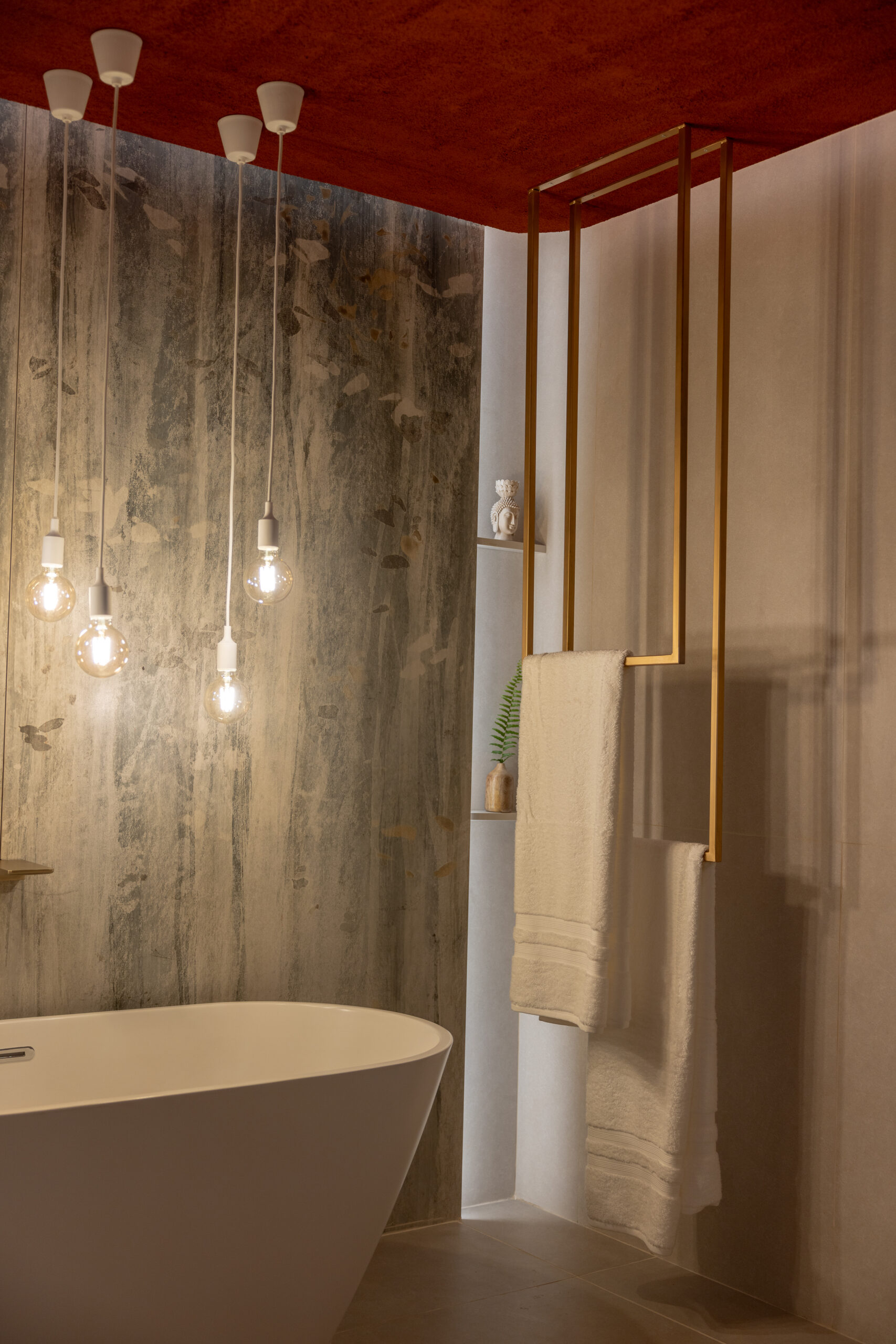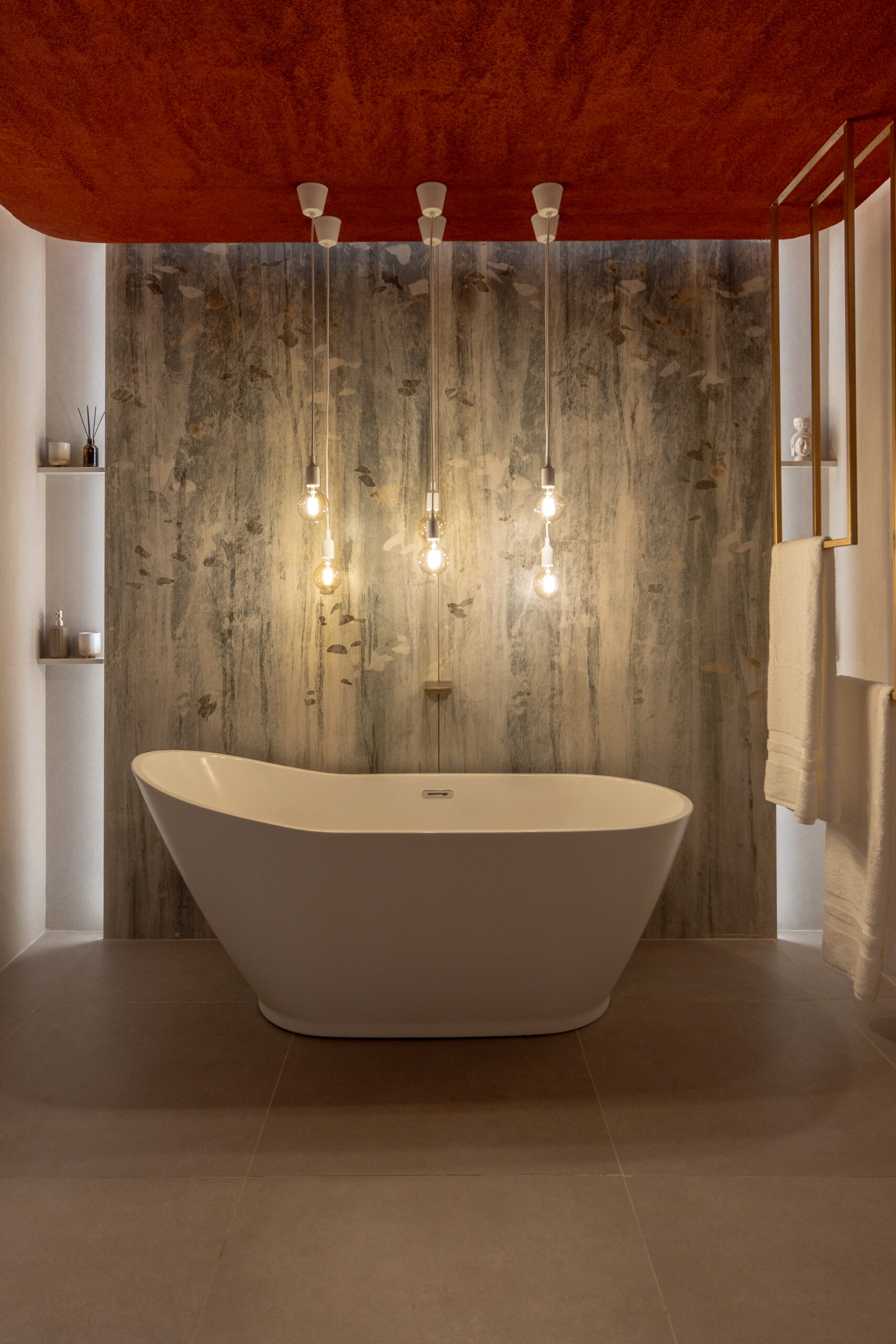 El punto de partida fue el porcelanato FAP de Acher: una pieza de 120×270 que, a pesar de ser porcelanato, evoca la delicadeza de un papel. Este material enmarca la bañera, generando una atmósfera cálida y envolvente gracias a una iluminación puntual y ambiental cuidadosamente diseñada.