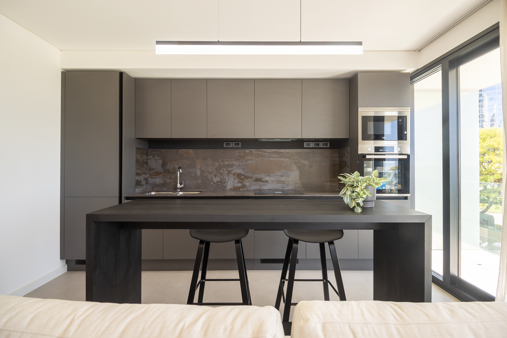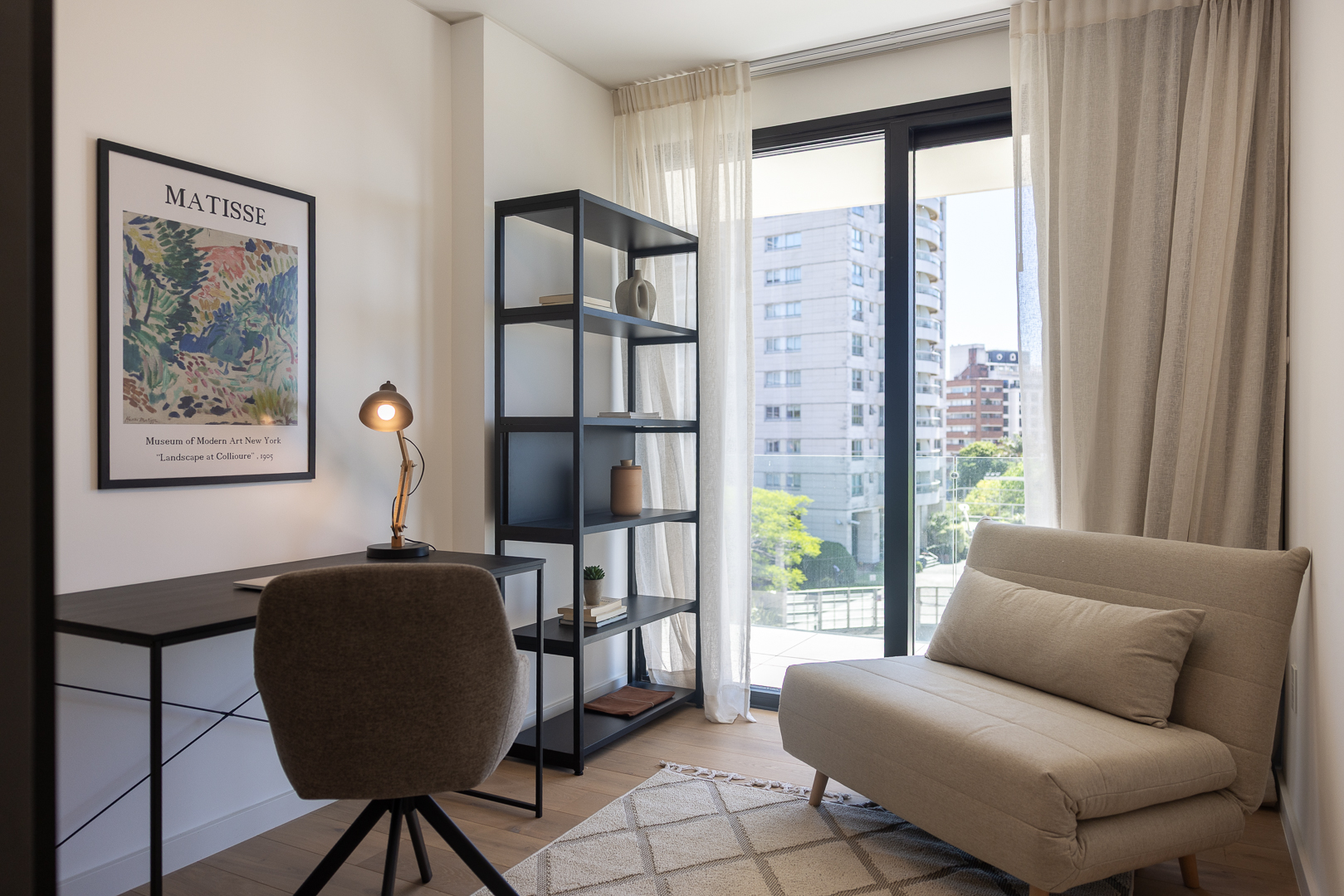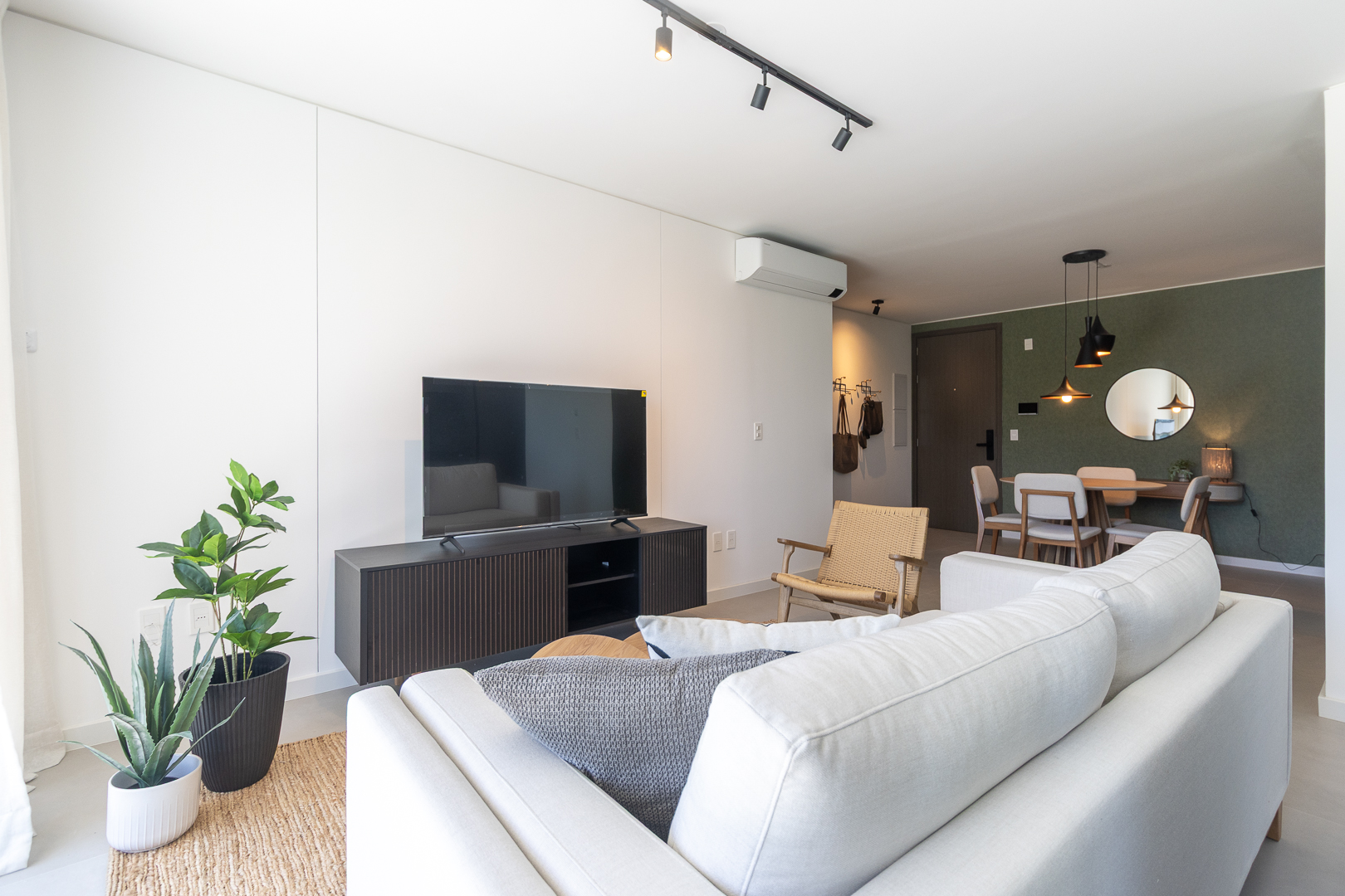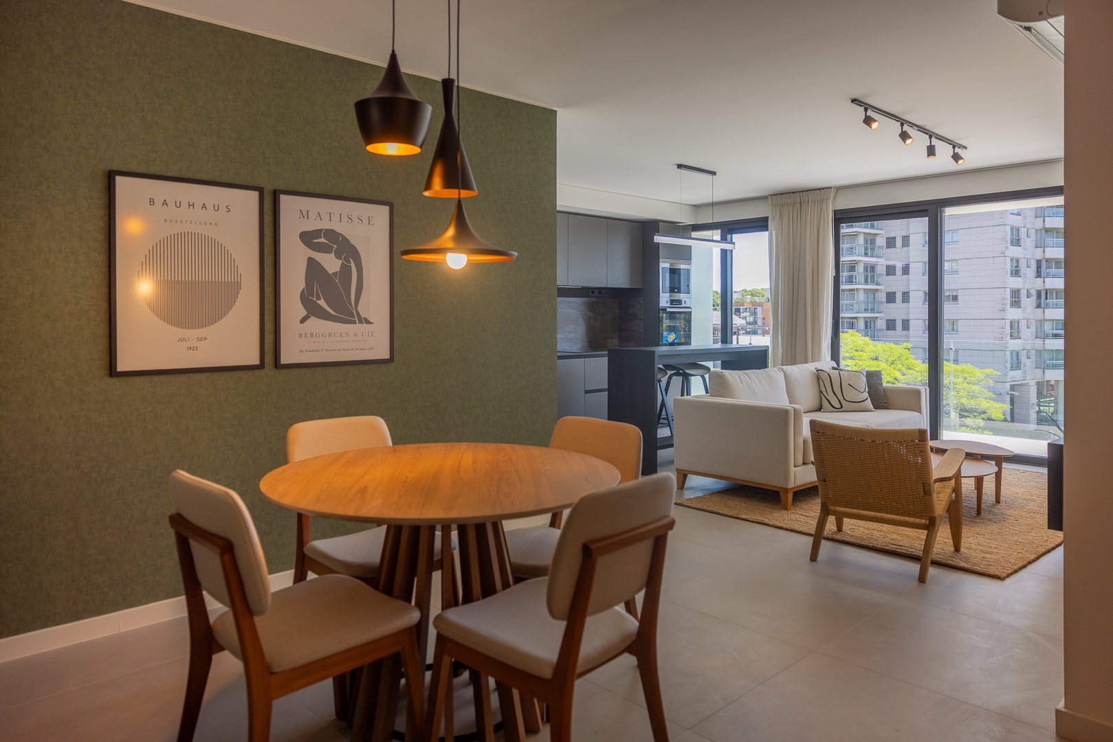 Se diseñó un living comedor totalmente equipado, incorporando una barra hecha a medida que organiza, complementa la cocina y define el espacio. El apartamento cuenta con dos dormitorios: el principal y uno secundario con sillón cama y un área de escritorio, resolviendo distintas necesidades de uso.