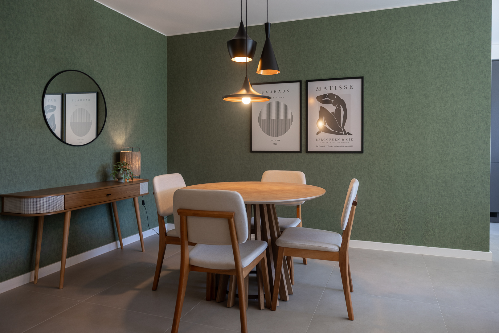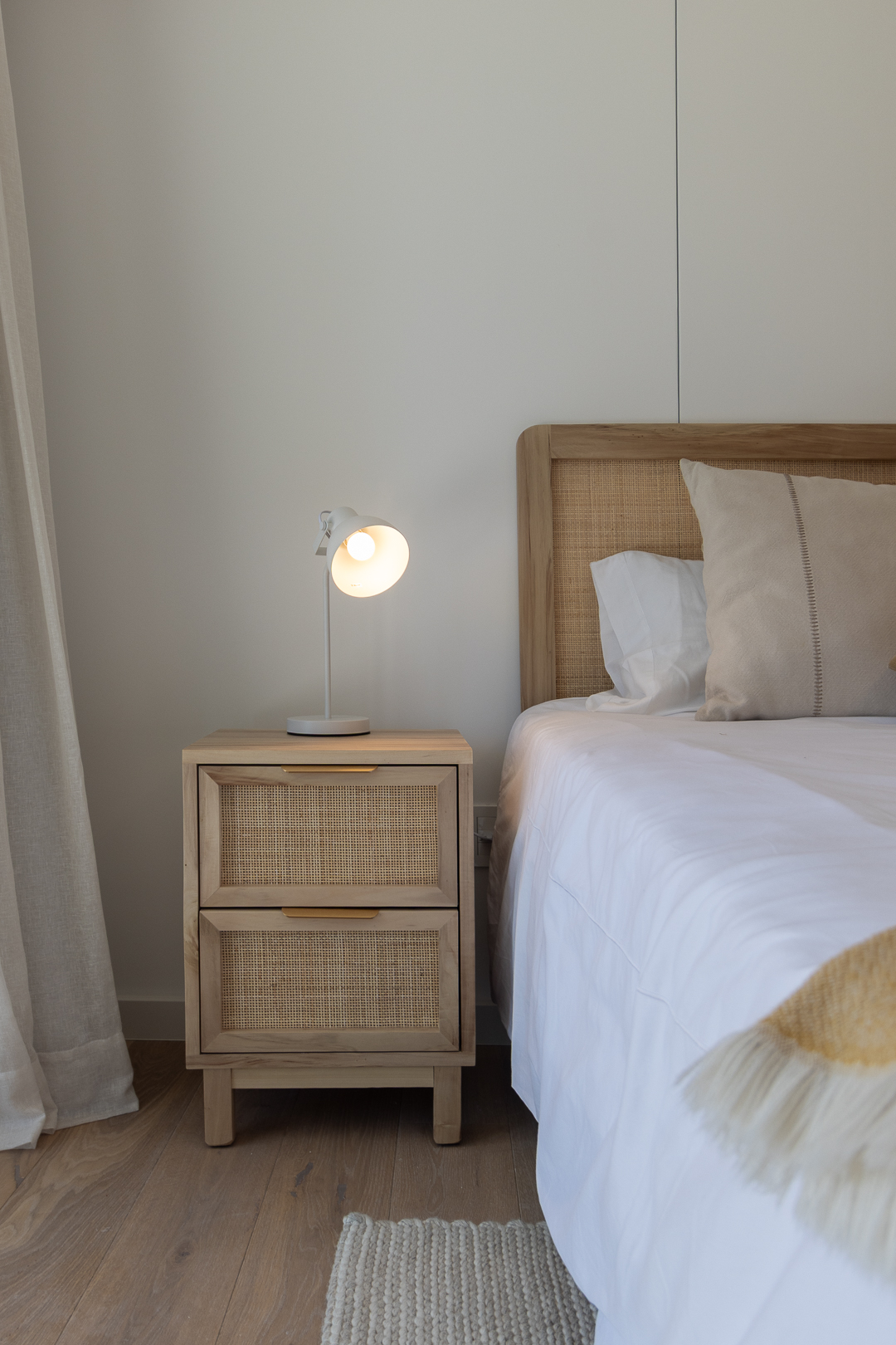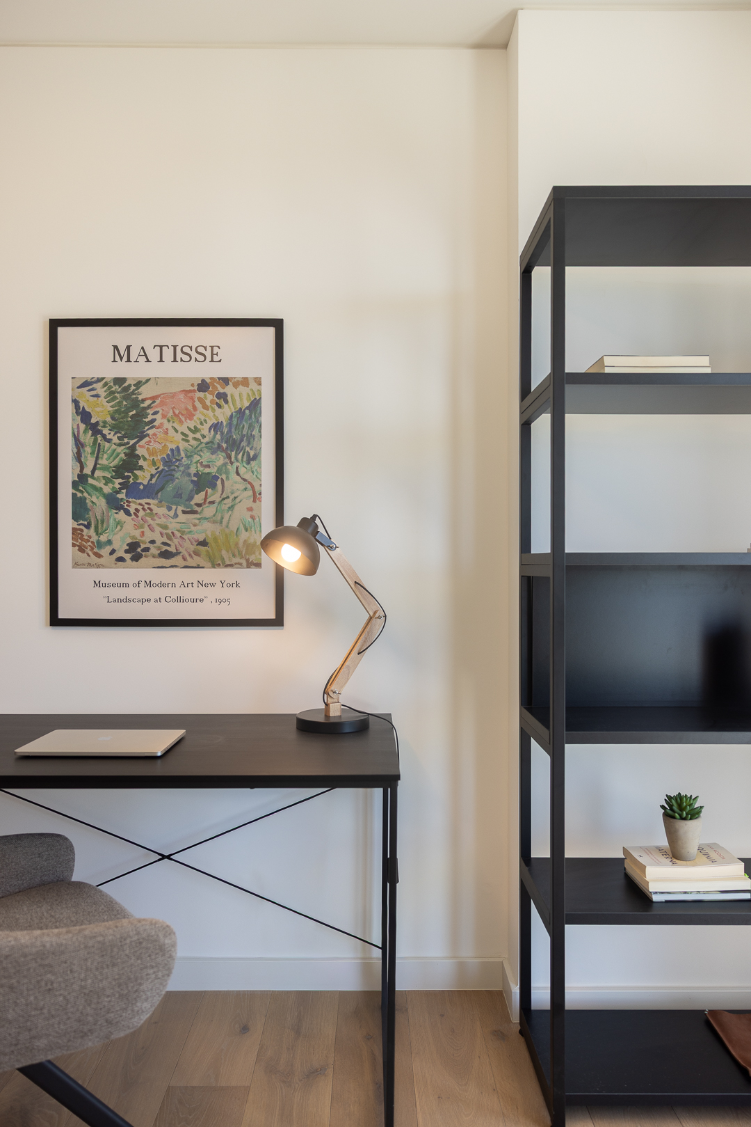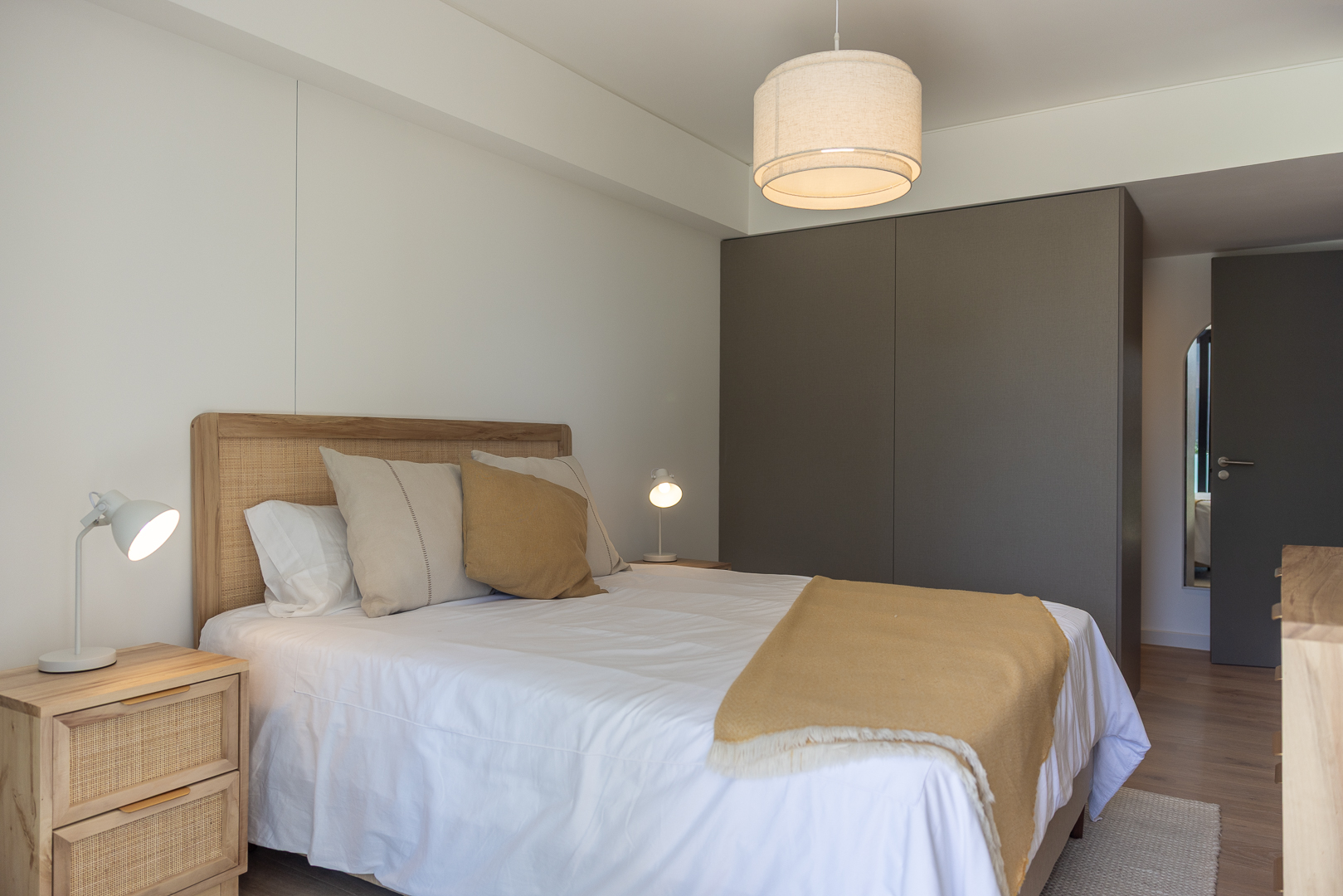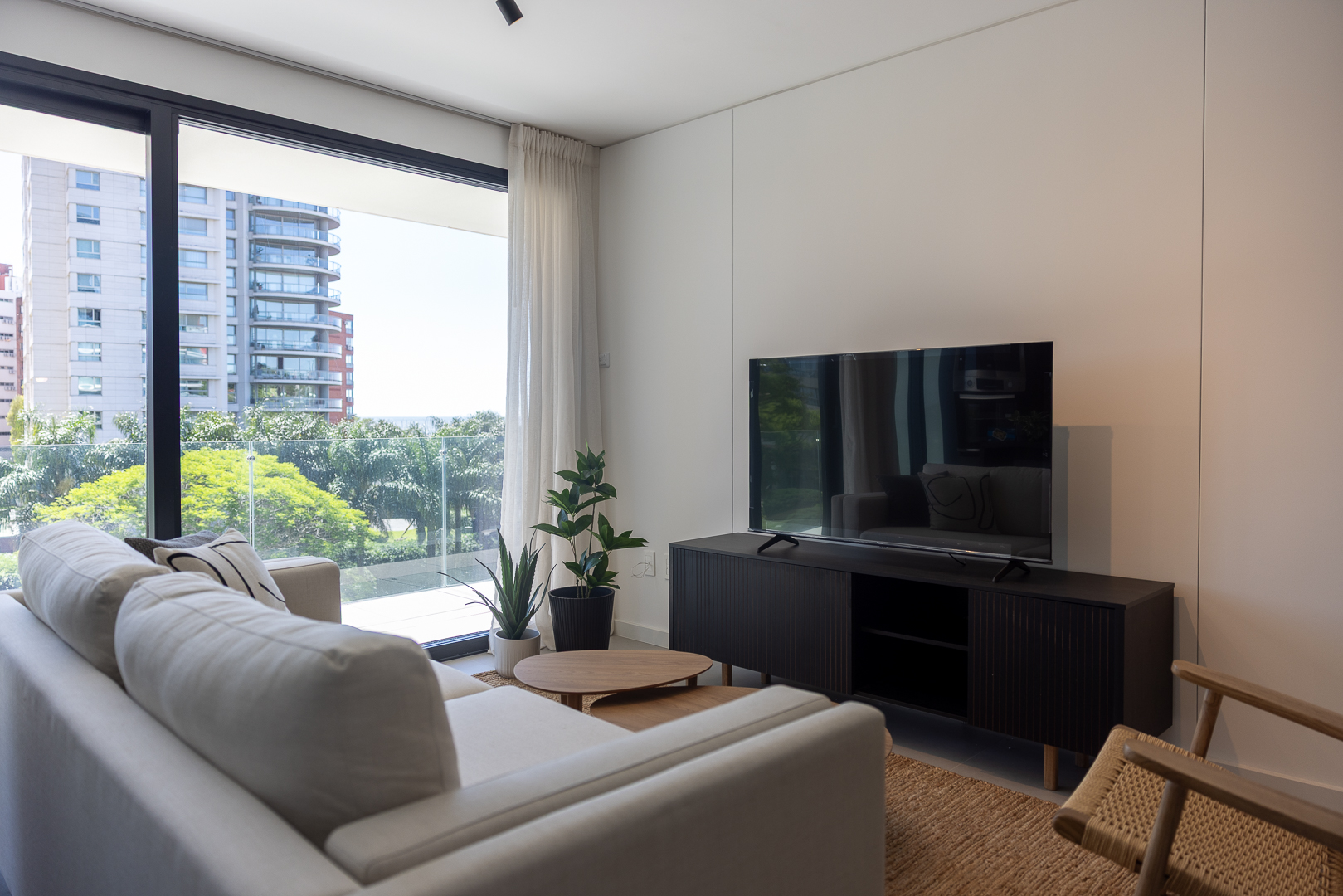 Se diseñó un living comedor totalmente equipado, incorporando una barra hecha a medida que organiza, complementa la cocina y define el espacio. El apartamento cuenta con dos dormitorios: el principal y uno secundario con sillón cama y un área de escritorio, resolviendo distintas necesidades de uso.