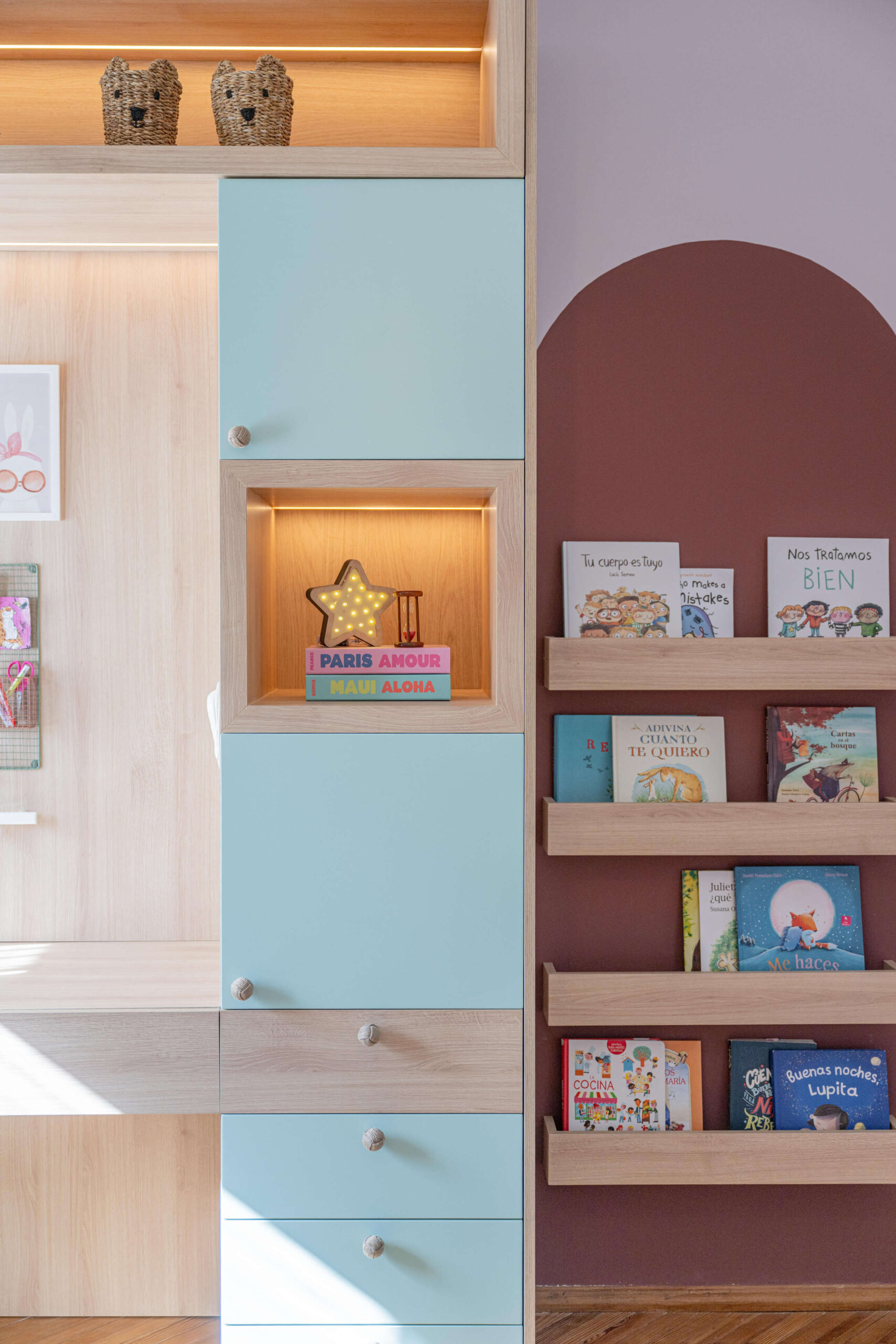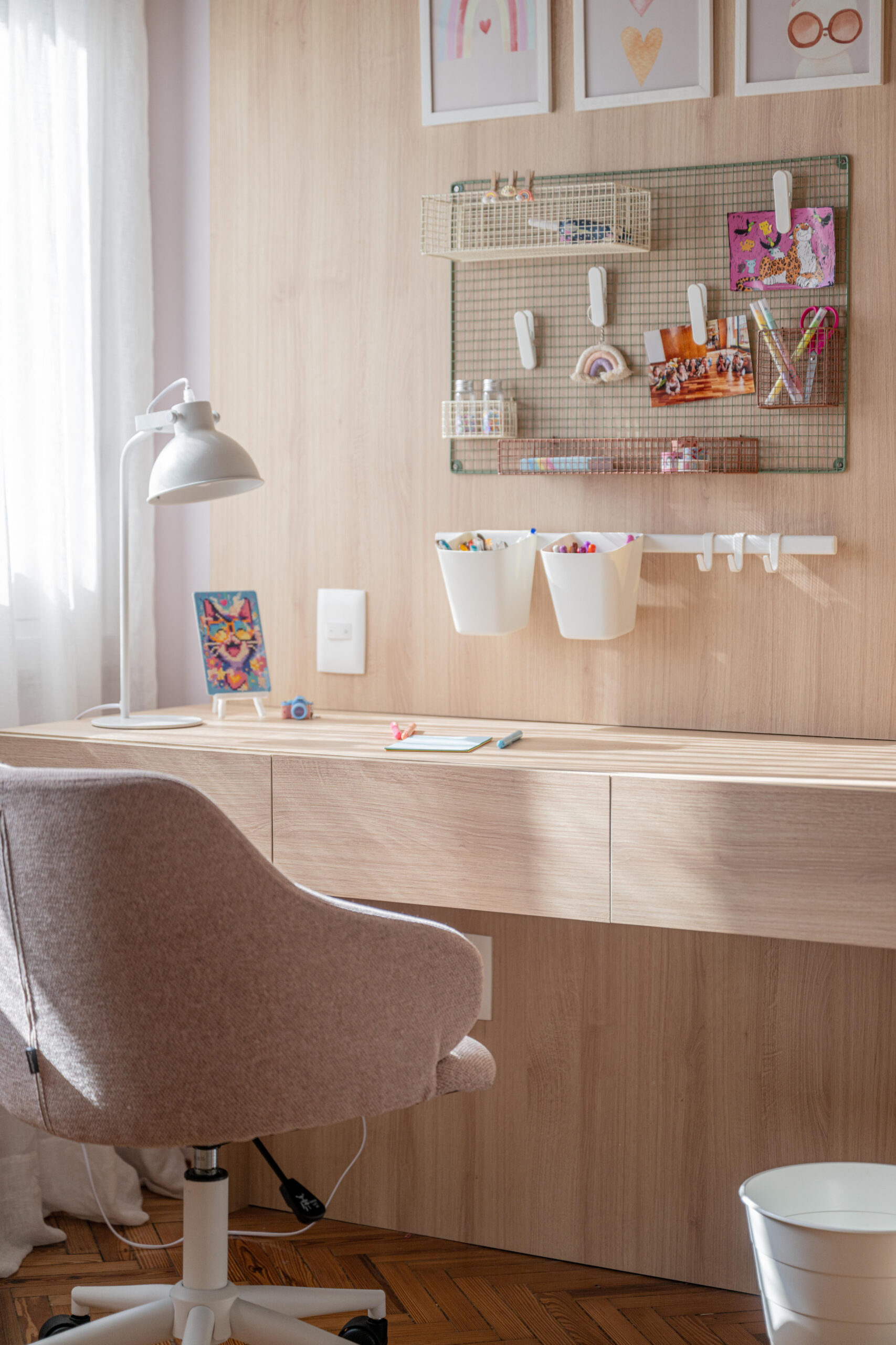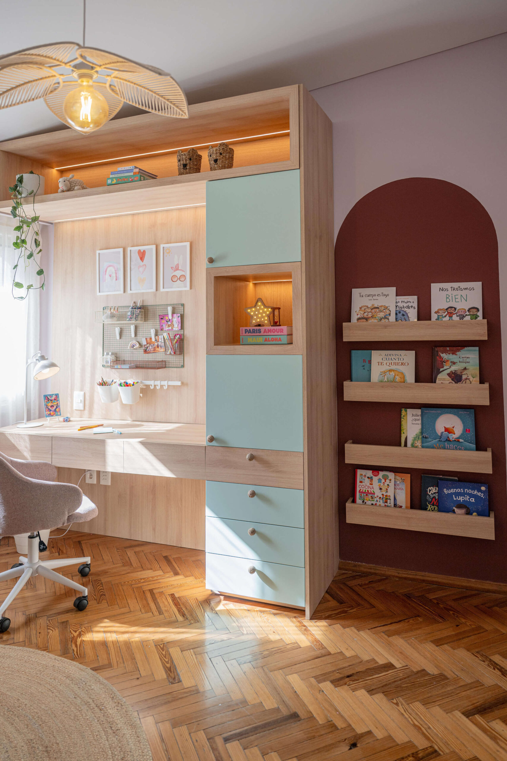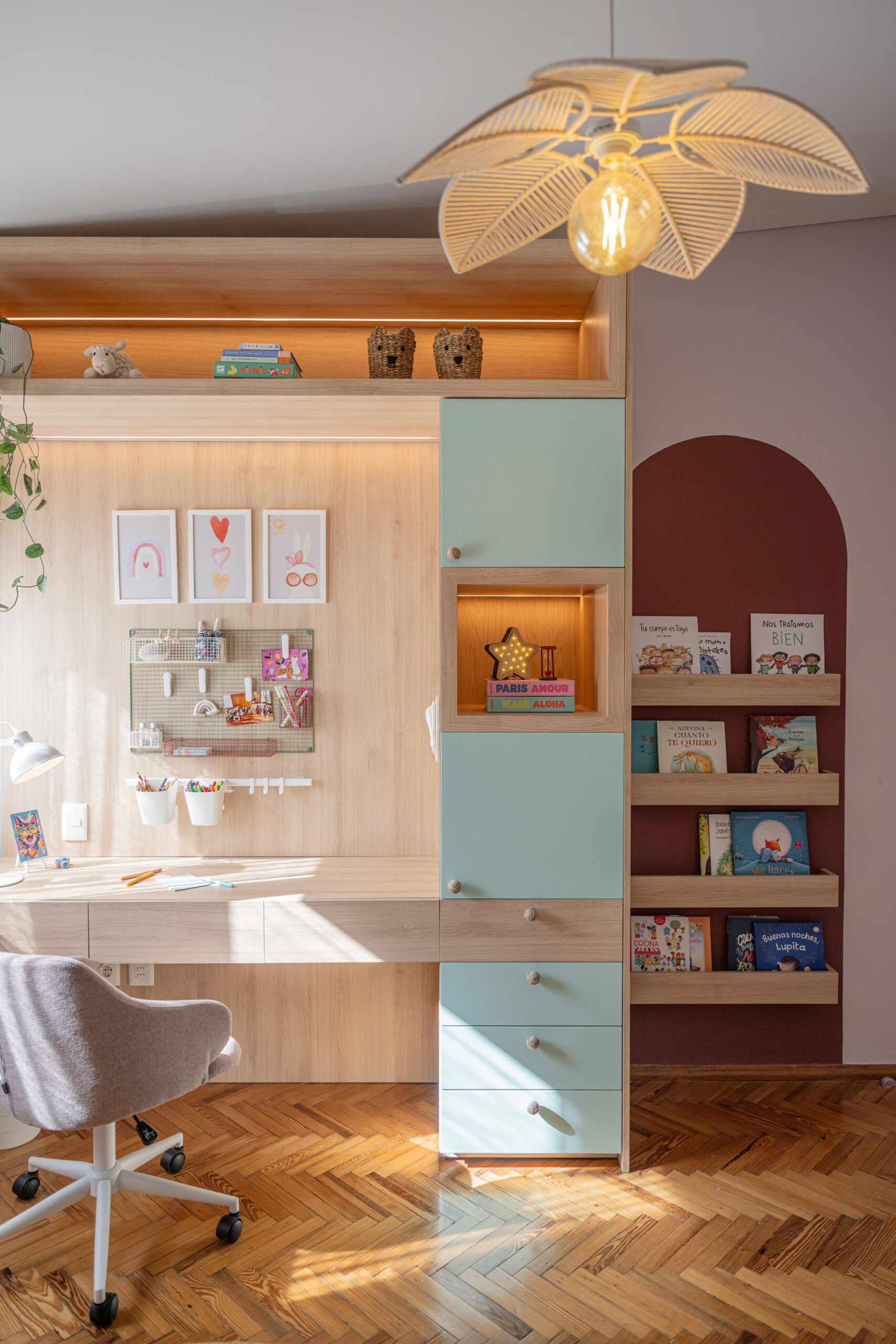 Proyecto de interiorismo integral para el dormitorio de una niña que comenzaba la etapa escolar. El diseño incluyó un espacio de trabajo pensado para sus primeros deberes, integrado a un ambiente lúdico y funcional.