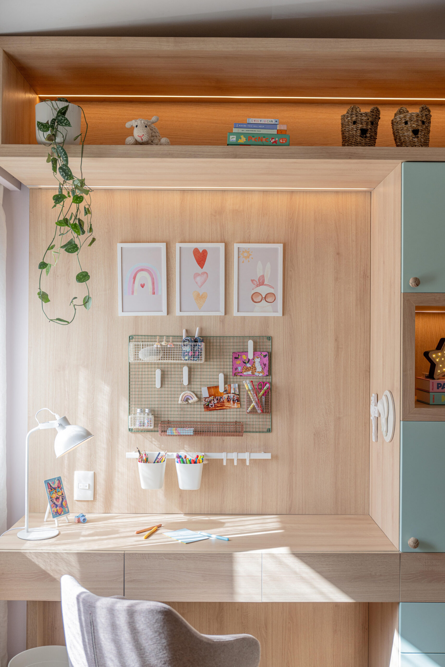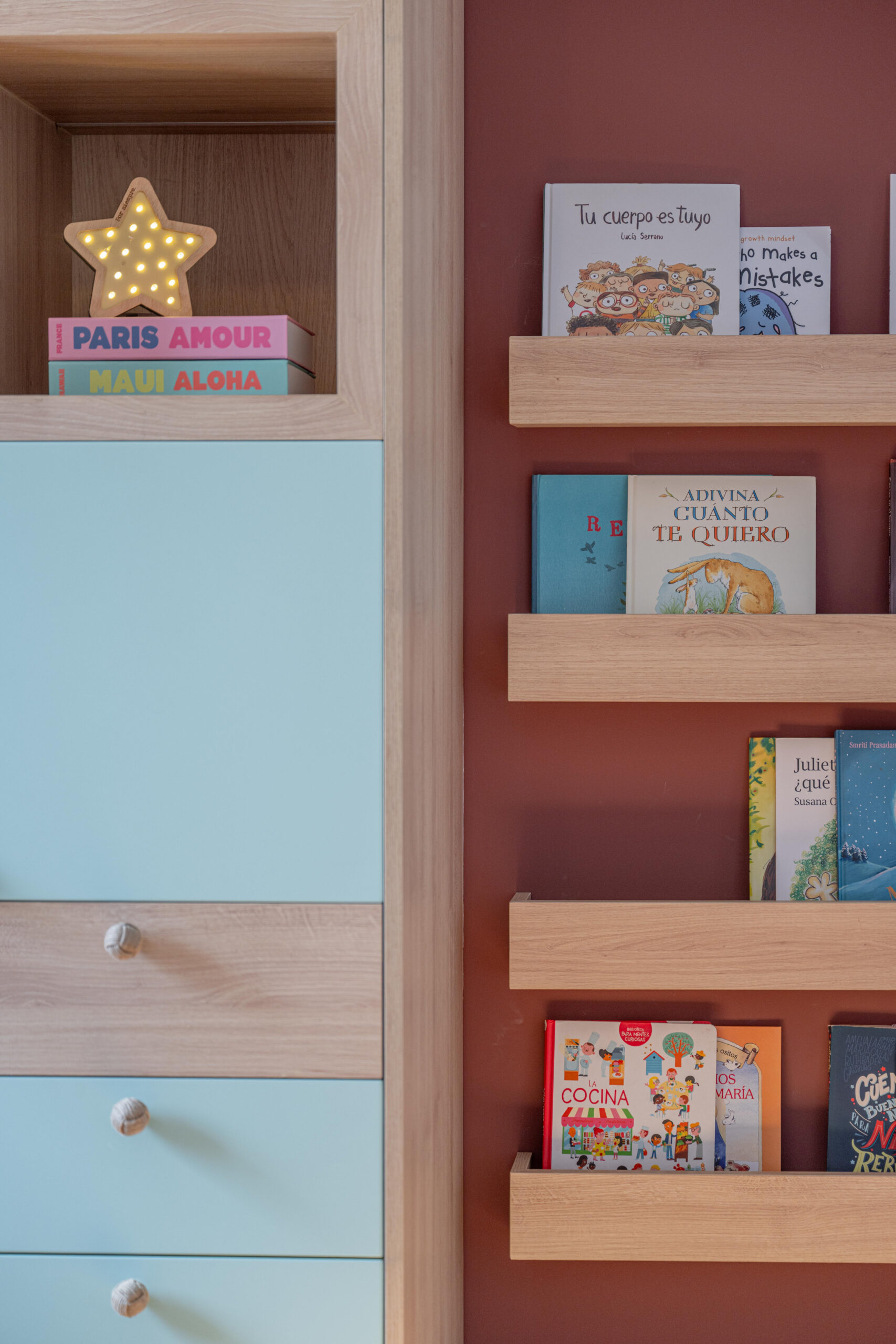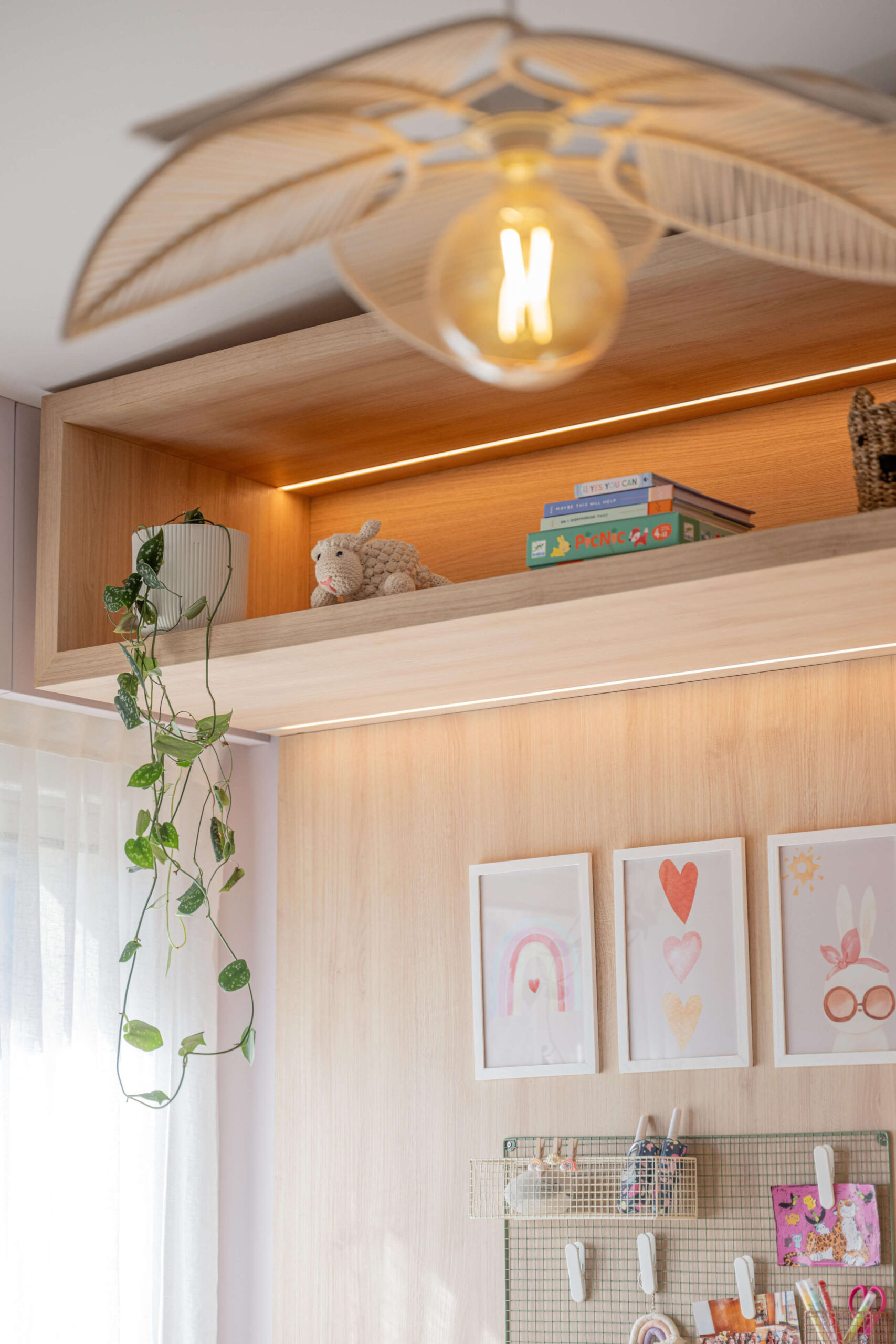 Proyecto de interiorismo integral para el dormitorio de una niña que comenzaba la etapa escolar. El diseño incluyó un espacio de trabajo pensado para sus primeros deberes, integrado a un ambiente lúdico y funcional.